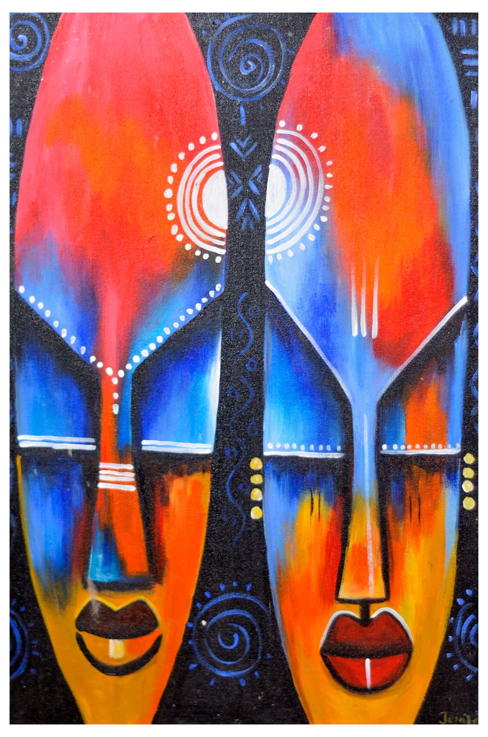 A striking abstract painting featuring two stylized African masks with vibrant colors and tribal-inspired patterns.