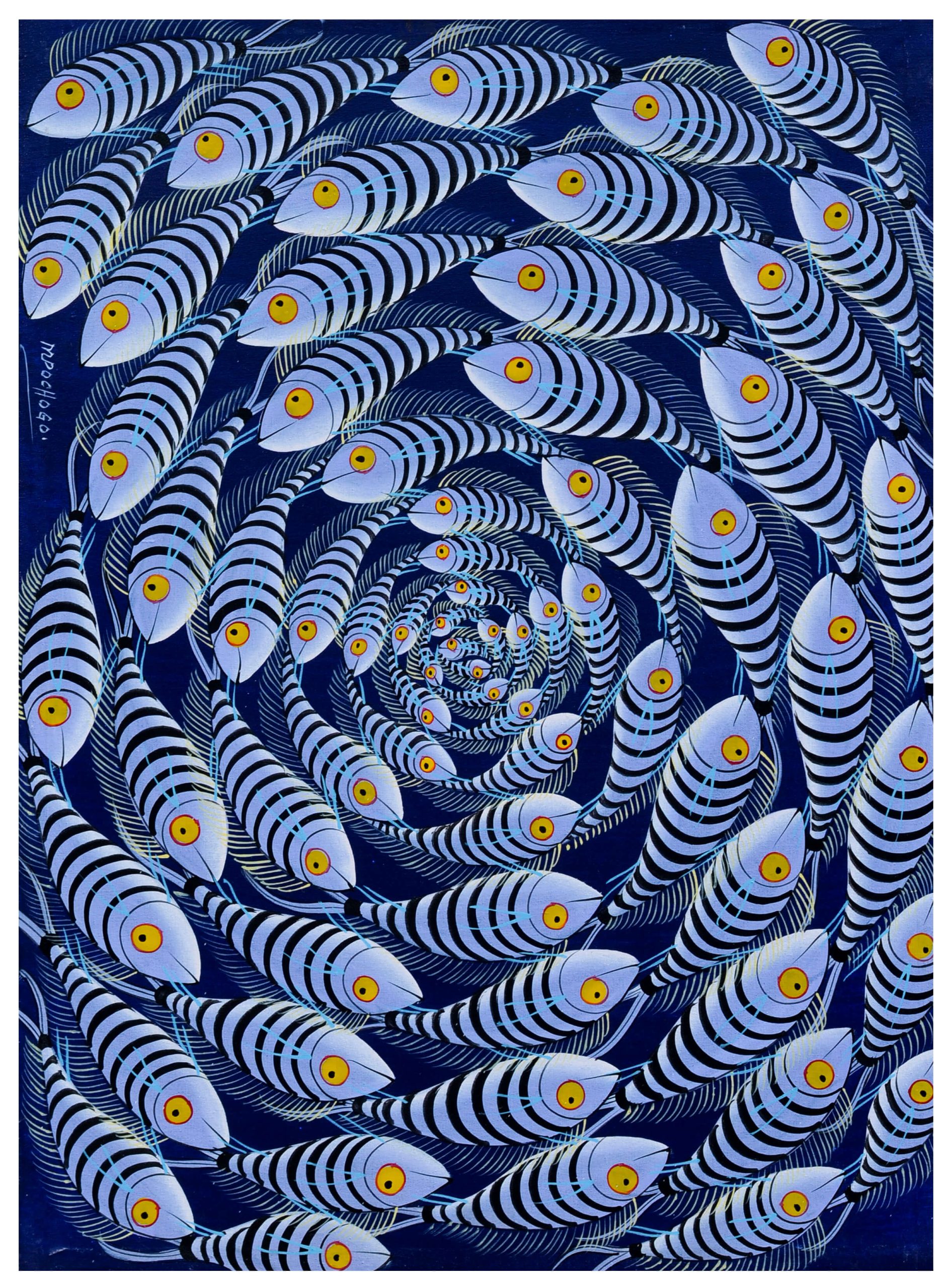 Add a dynamic and artistic touch to your space with this African fish pattern painting. The artwork features dozens of stylized fish swimming in a mesmerizing spiral formation, creating a sense of movement and rhythm across the canvas.