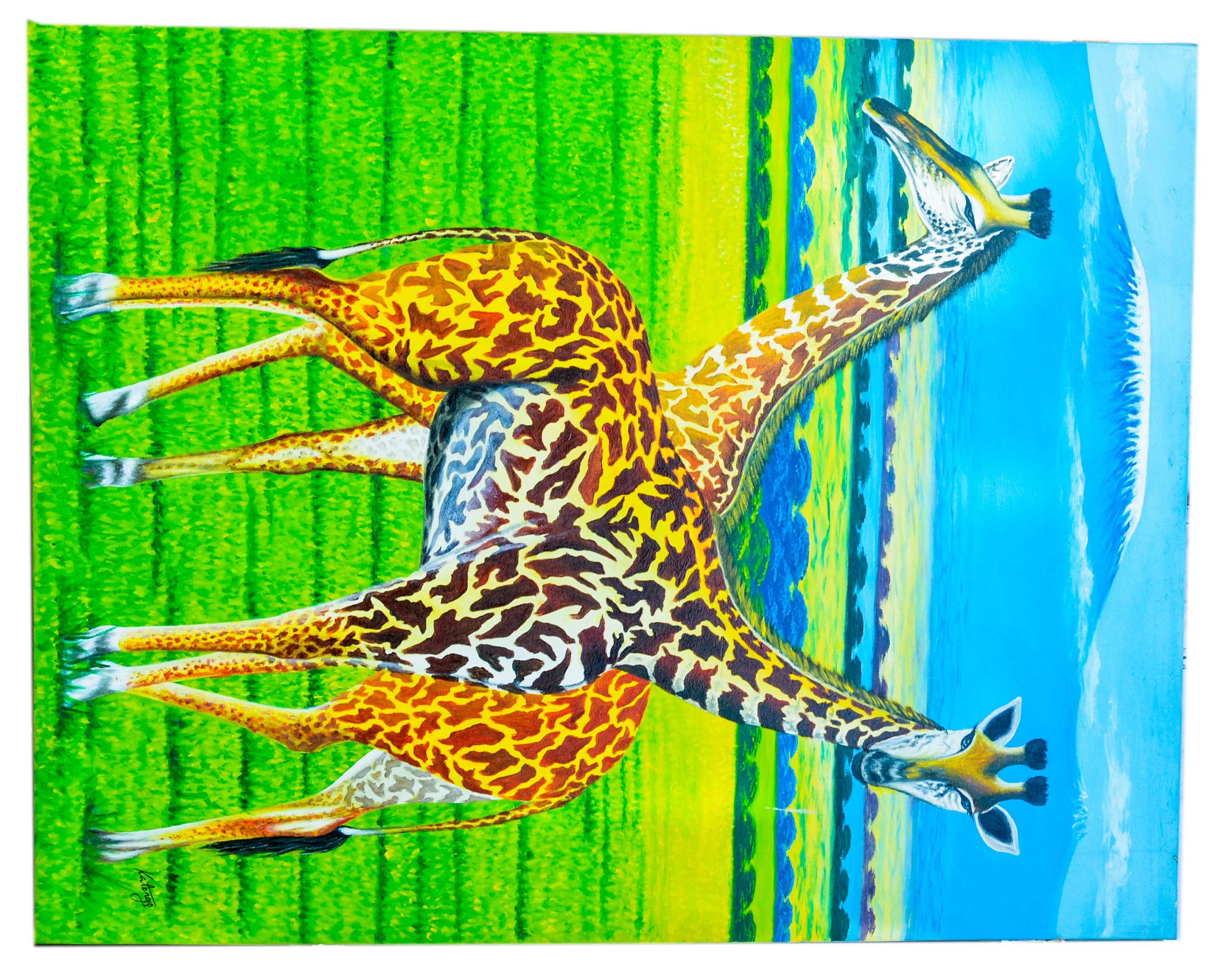 The painting features two elegant giraffes standing together in a lush green savannah, their long necks reaching upward against a bright blue sky. The warm golden patterns on their bodies contrast beautifully with the vivid greens of the landscape, creating a dynamic and eye-catching composition.