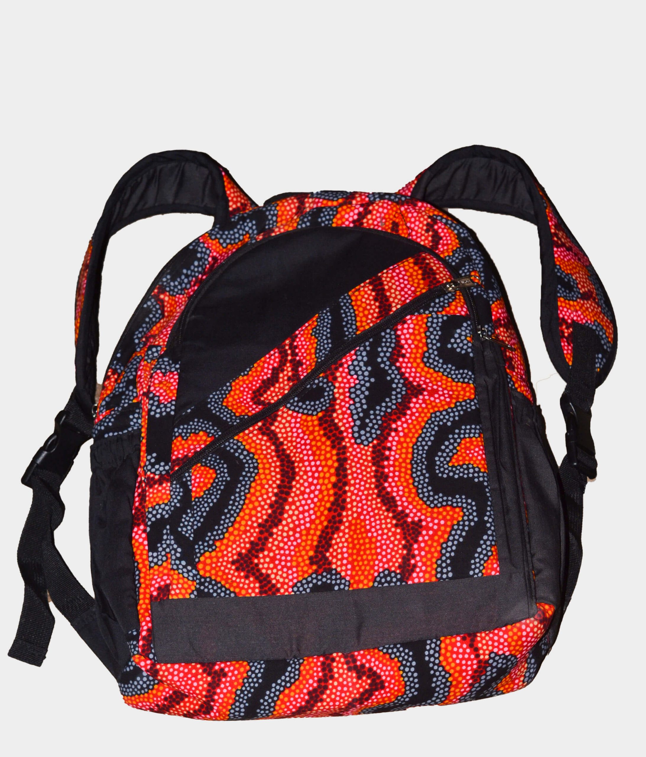 A stylish African print backpack featuring vibrant red, black, and orange patterns. A unique ethnic design perfect for school, travel, and everyday use.