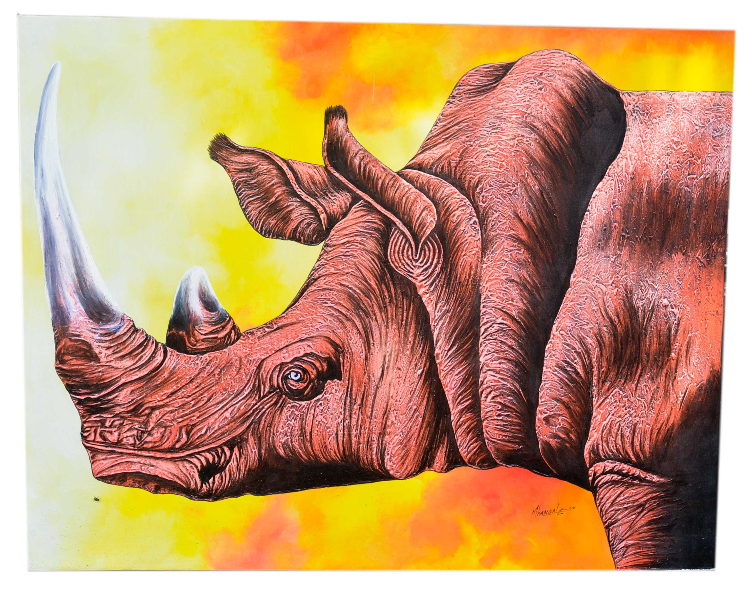 Set against a vibrant yellow and orange background, the rhino stands out dramatically, creating a bold and eye-catching composition. The textured brushwork adds depth and realism, emphasizing the rugged beauty of this iconic African animal.