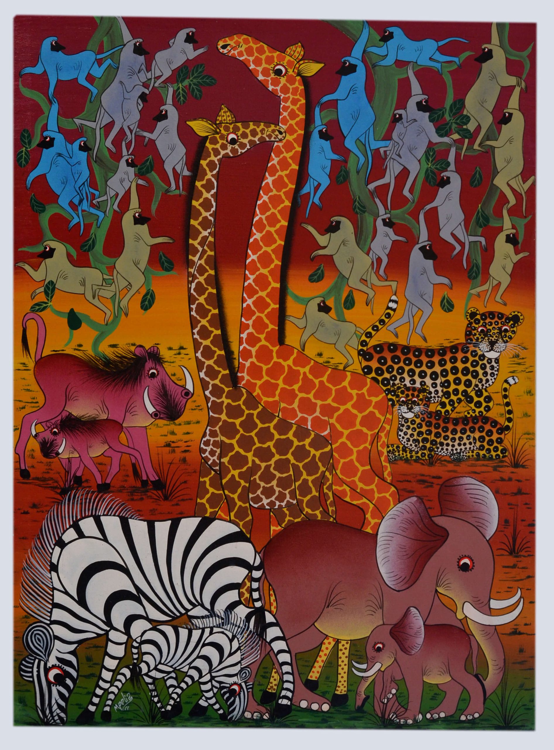 A vibrant African safari painting featuring giraffes, zebras, elephants, monkeys, leopards, and other wildlife in a colorful jungle scene. This lively artwork celebrates the beauty and diversity of African nature.