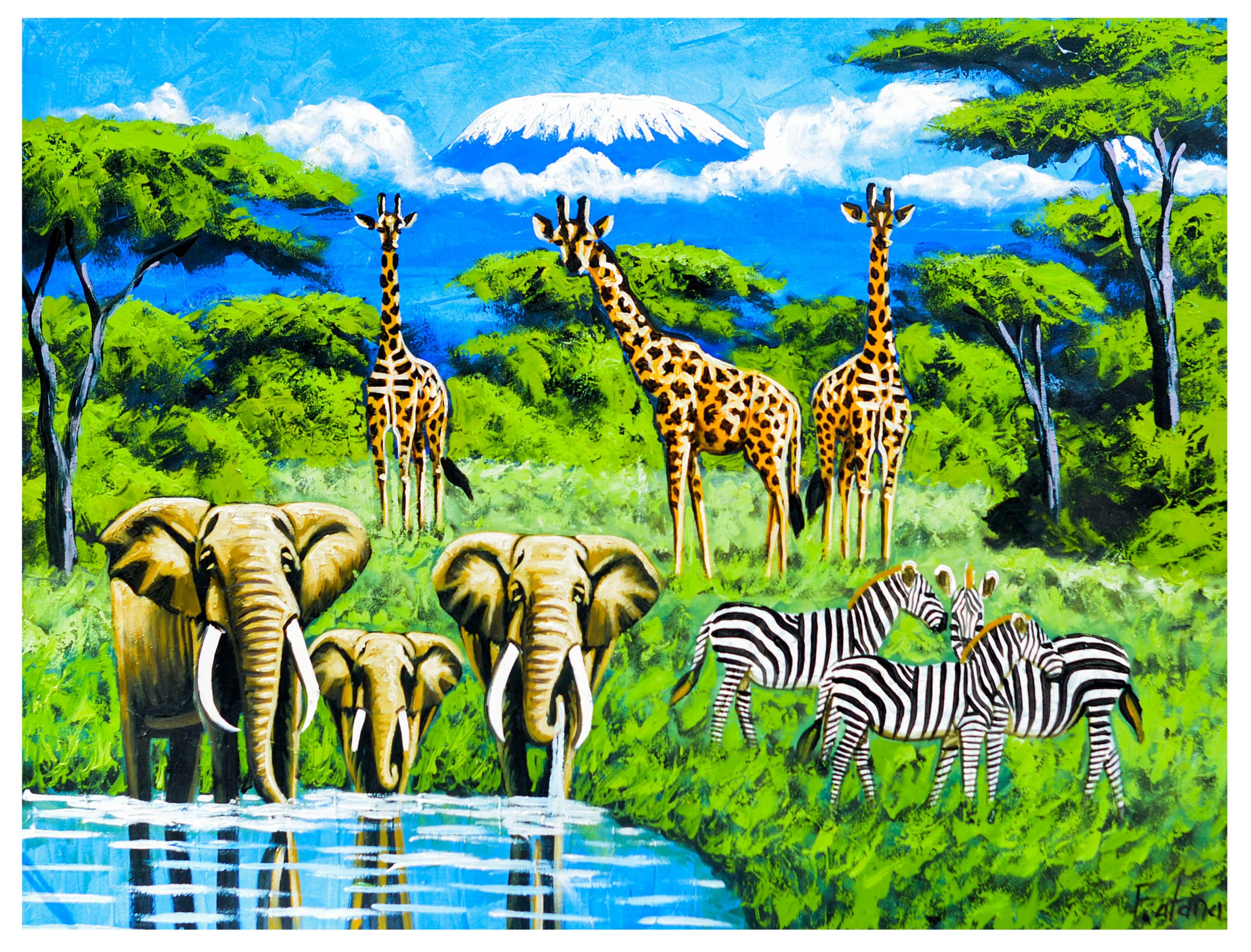 Bold brushstrokes and bright colors give the scene a lively and expressive artistic style. The elephants drinking from the water, the zebras grazing together, and the giraffes standing tall create a balanced and dynamic composition full of life and movement.