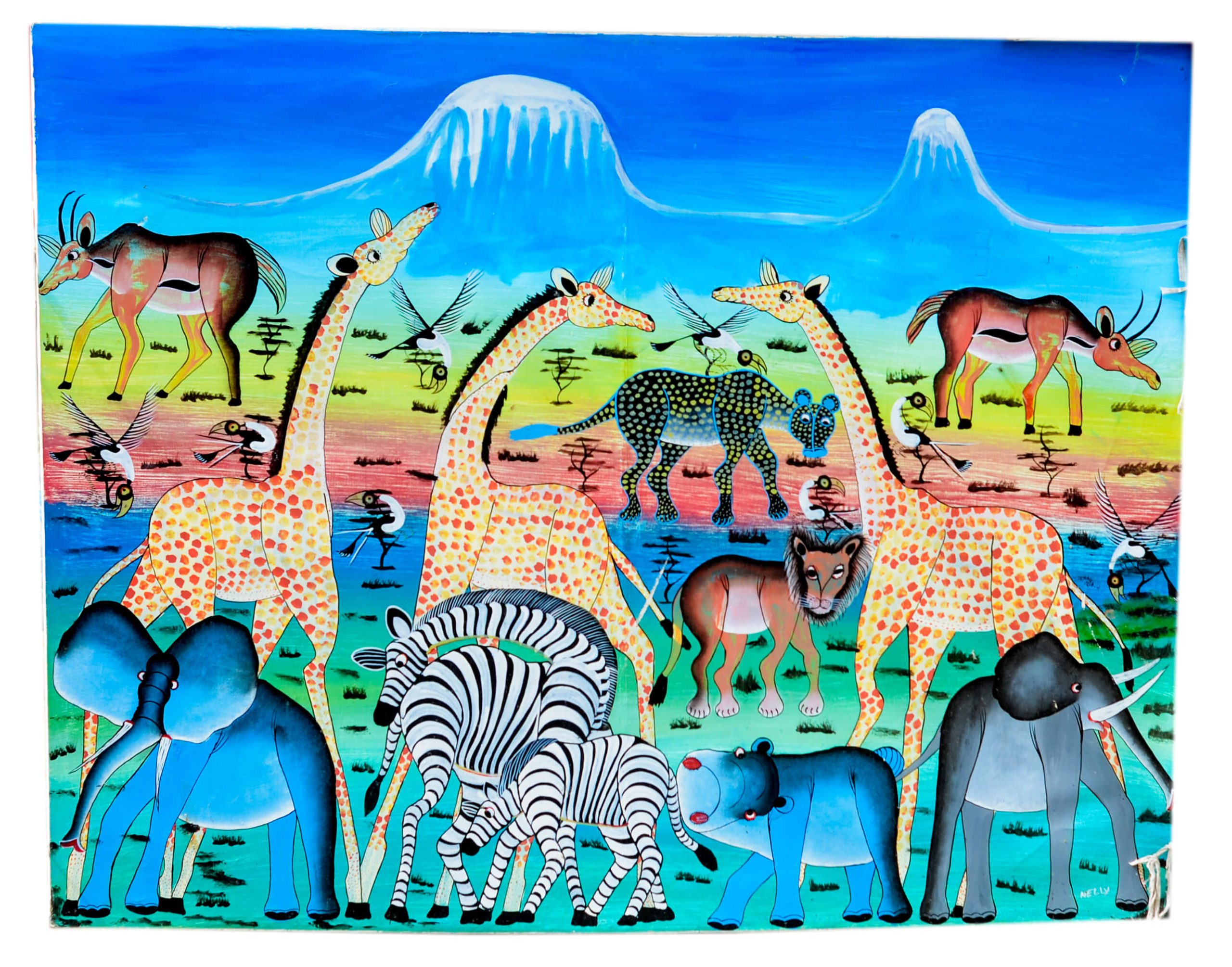 The artistic style is playful and expressive, with stylized animal shapes and bright colors that give the artwork a unique African folk art character. Each animal is illustrated with charming details that bring life and personality to the scene.