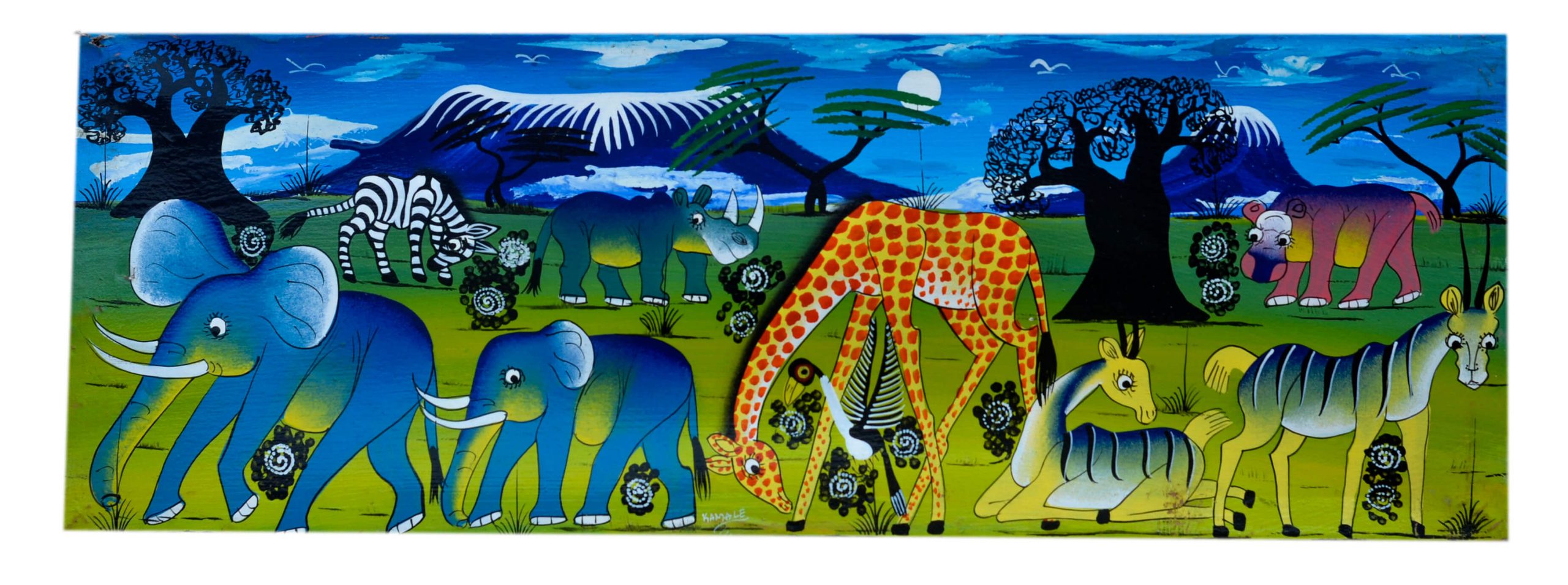 Painted in bold colors and playful shapes, the animals are arranged across a panoramic composition that captures the richness of the African ecosystem. In the background, stylized trees, mountains, and a blue sky create a peaceful and vibrant safari environment.