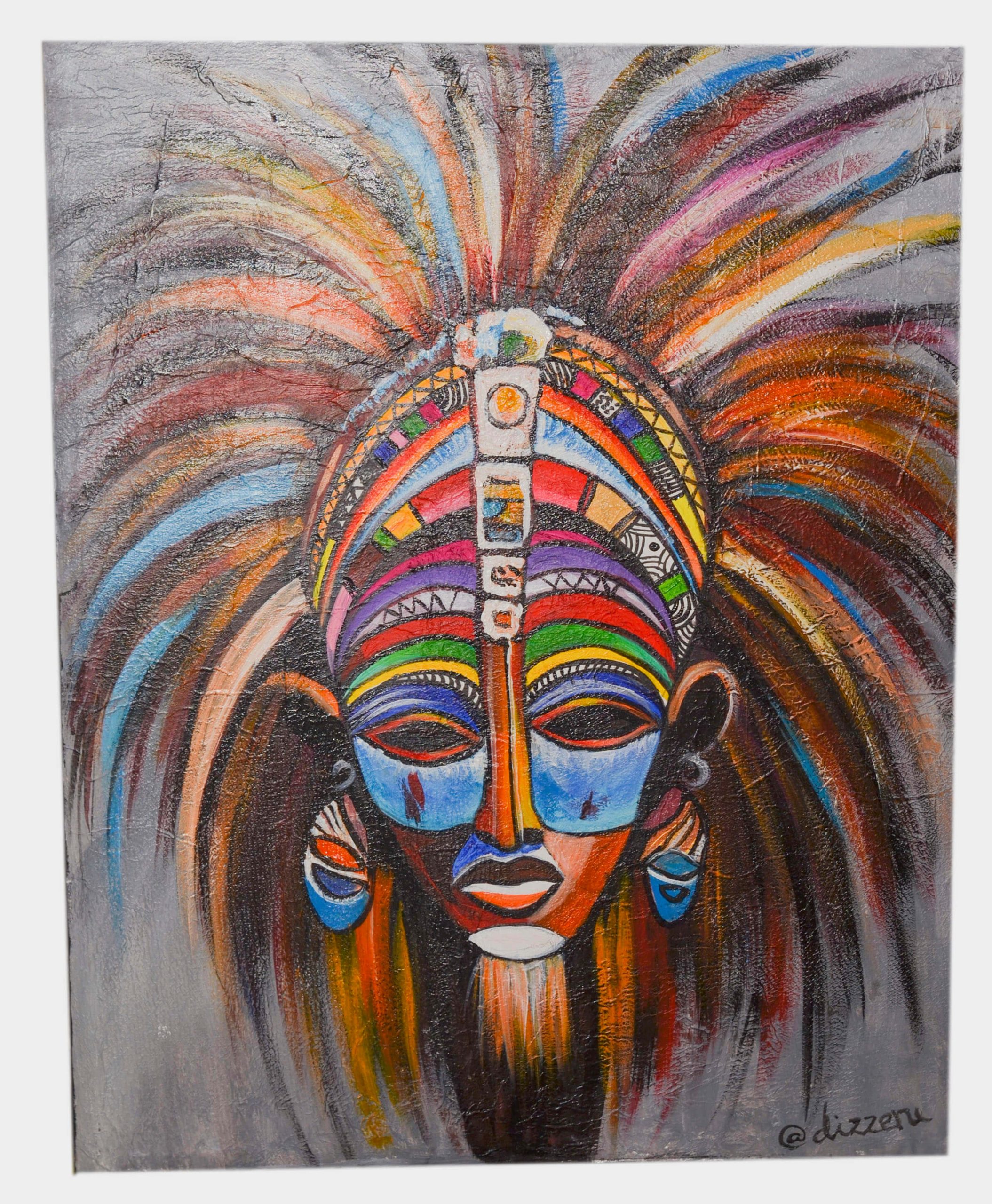 A bold and expressive artwork featuring a traditional African-inspired mask with vibrant colors and dramatic feathered headwear.