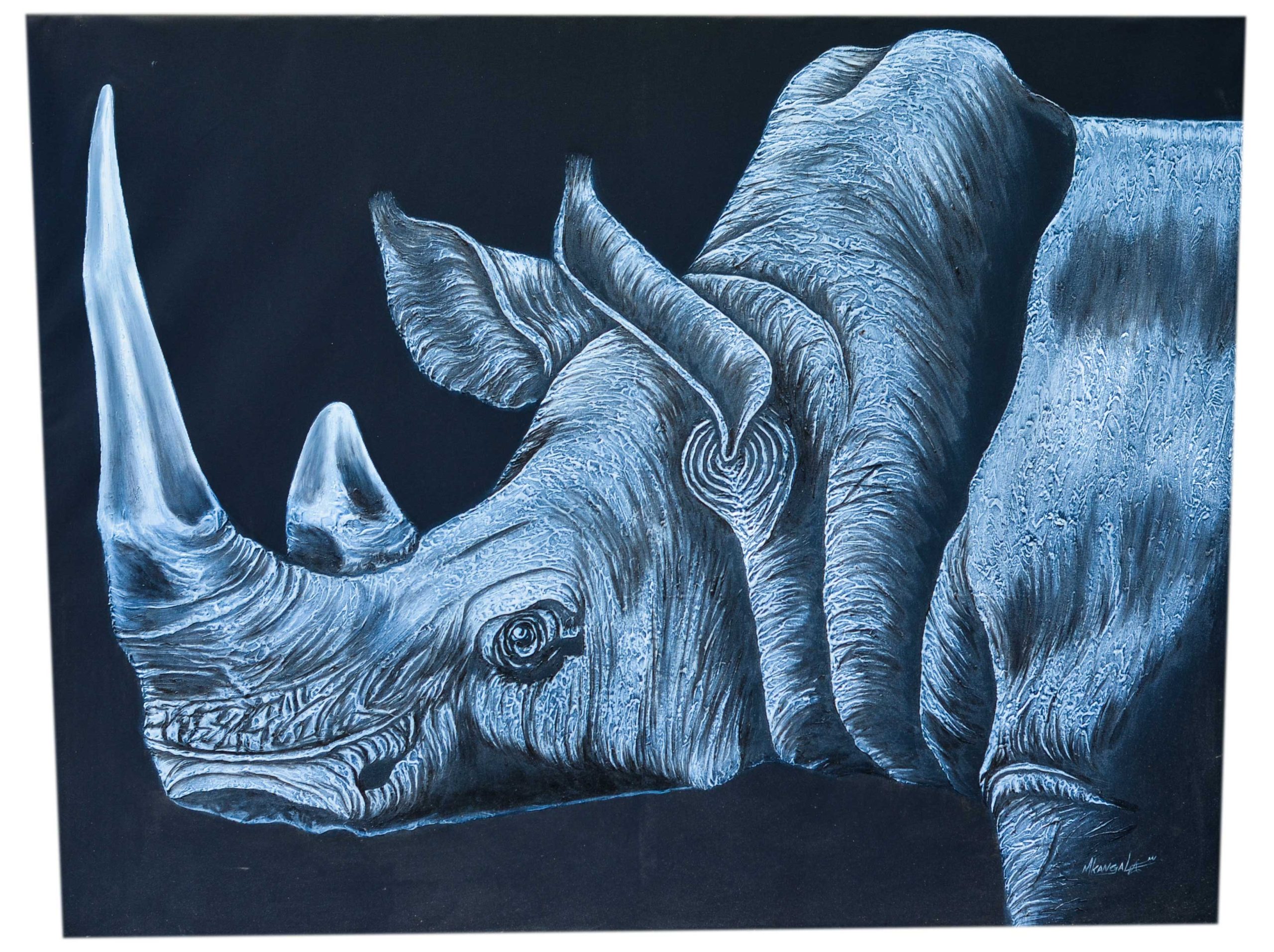 The painting features a close-up portrait of a rhinoceros, emphasizing its massive horn, textured skin, and intense gaze. The monochrome color palette highlights every detail of the rhino’s rugged form, creating a striking visual contrast against the deep dark background.