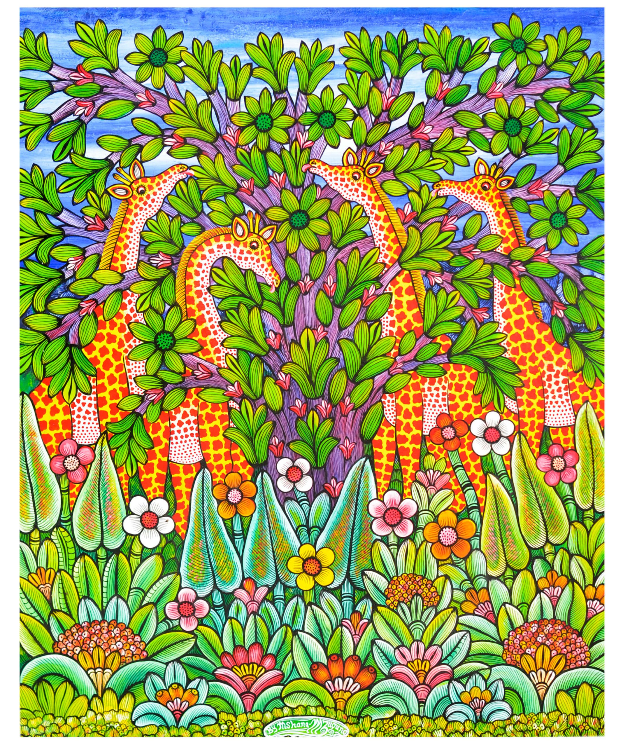 This vibrant artwork captures a charming wildlife scene with several graceful giraffes standing among lush trees, leaves, and blooming flowers. The composition is filled with bright colors and intricate patterns that create a lively and cheerful atmosphere.