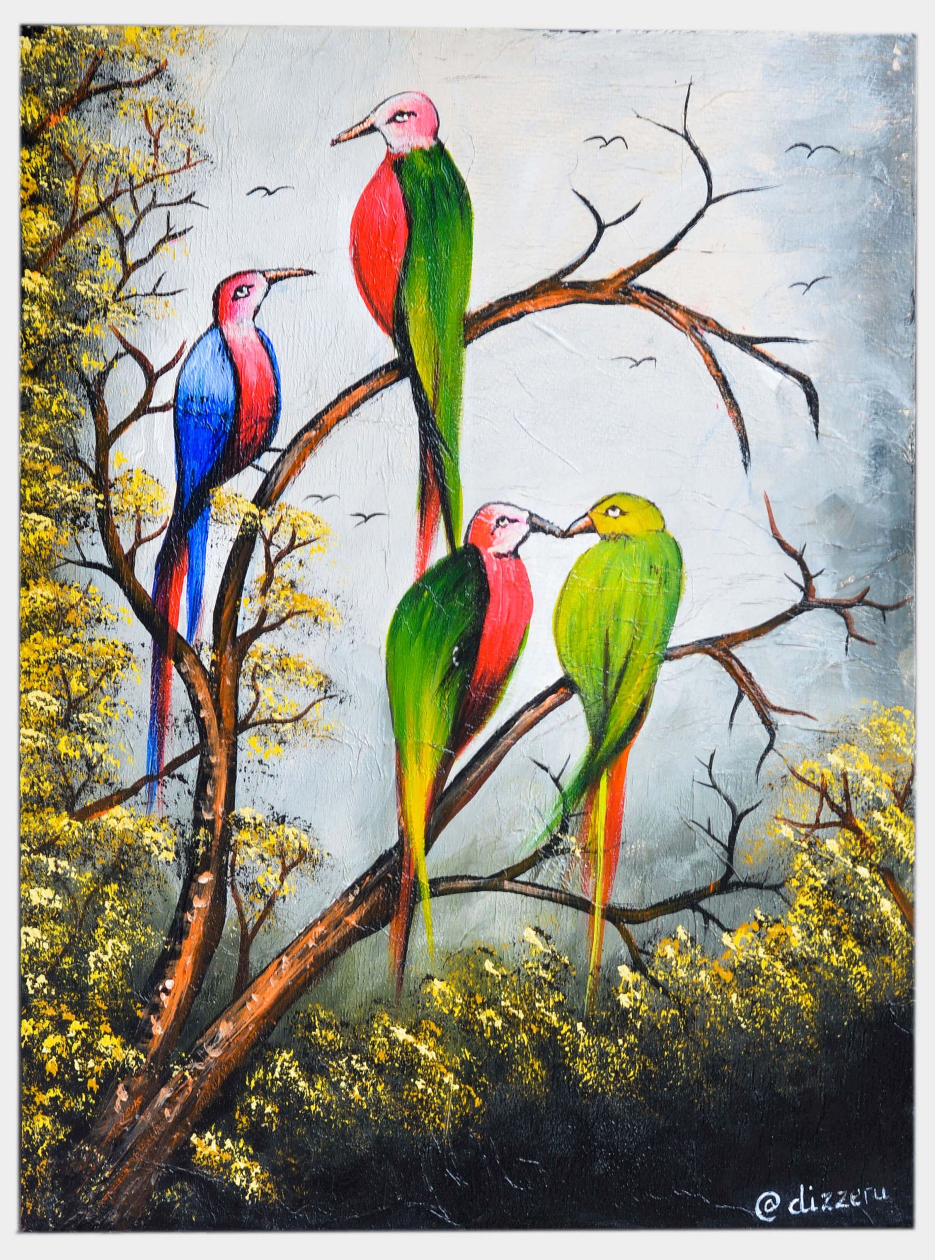 The parrots are perched gracefully on branches surrounded by delicate yellow foliage and textured tree trunks. Their long tails and elegant posture create a sense of movement and balance within the composition. Two birds appear to interact closely, adding a charming and expressive touch to the artwork.