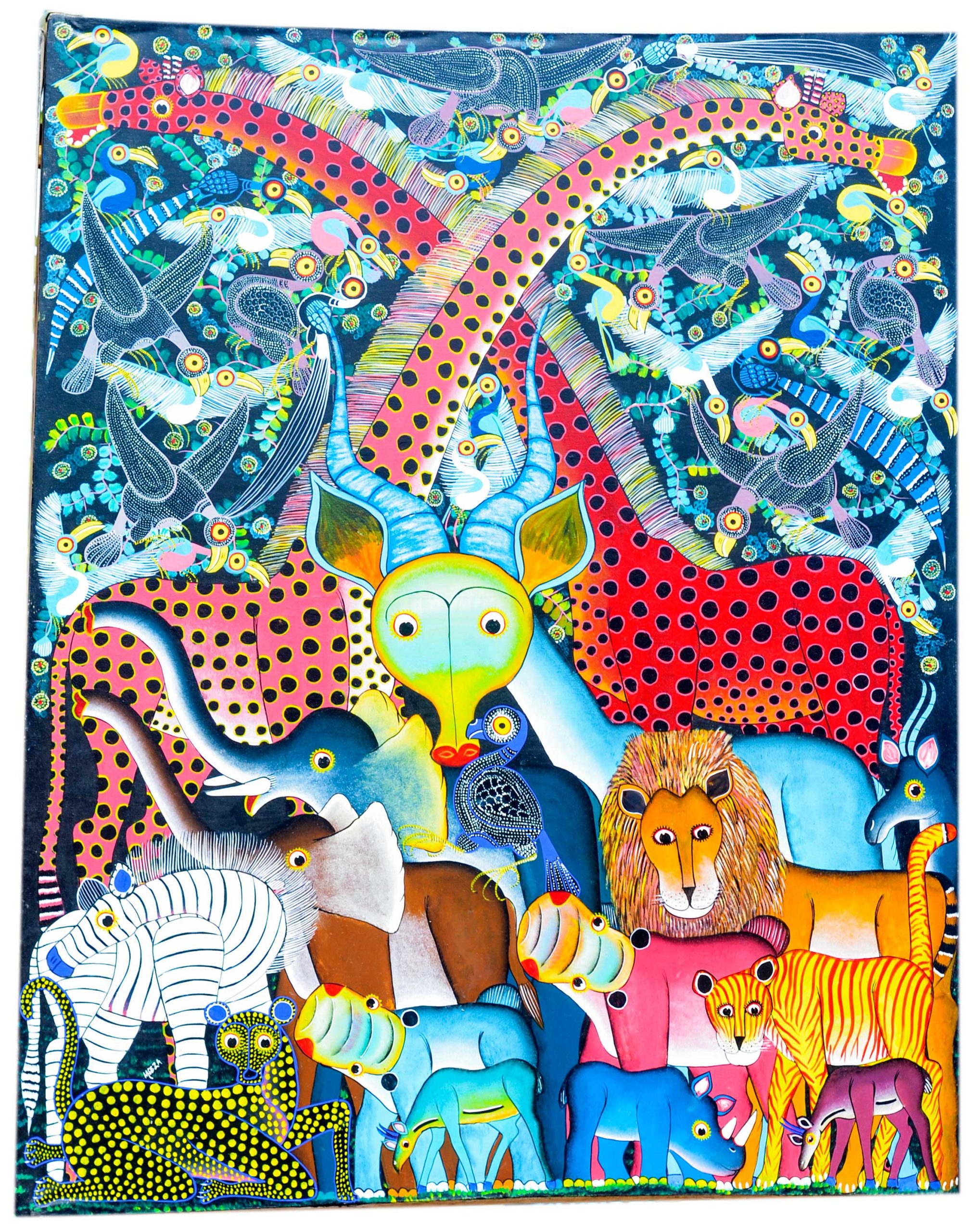 A bold and colorful folk art painting featuring a collection of safari animals surrounded by birds and vibrant patterns. This lively wildlife artwork brings energy, creativity, and exotic charm to any space.