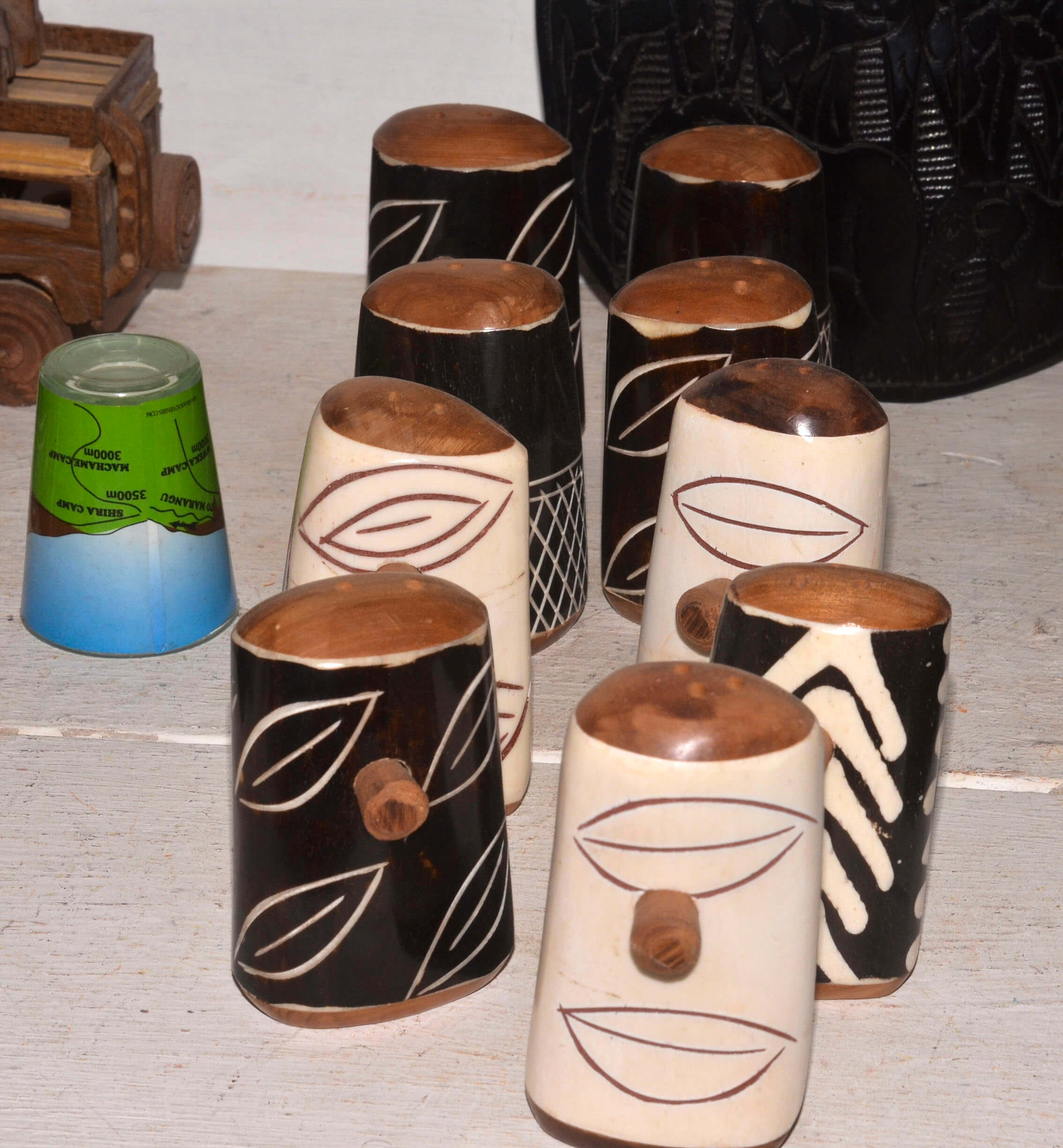 A unique hand-carved African spice container set made from natural bone and horn materials, featuring traditional tribal patterns. Perfect for storing spices, small items, or as decorative cultural décor.