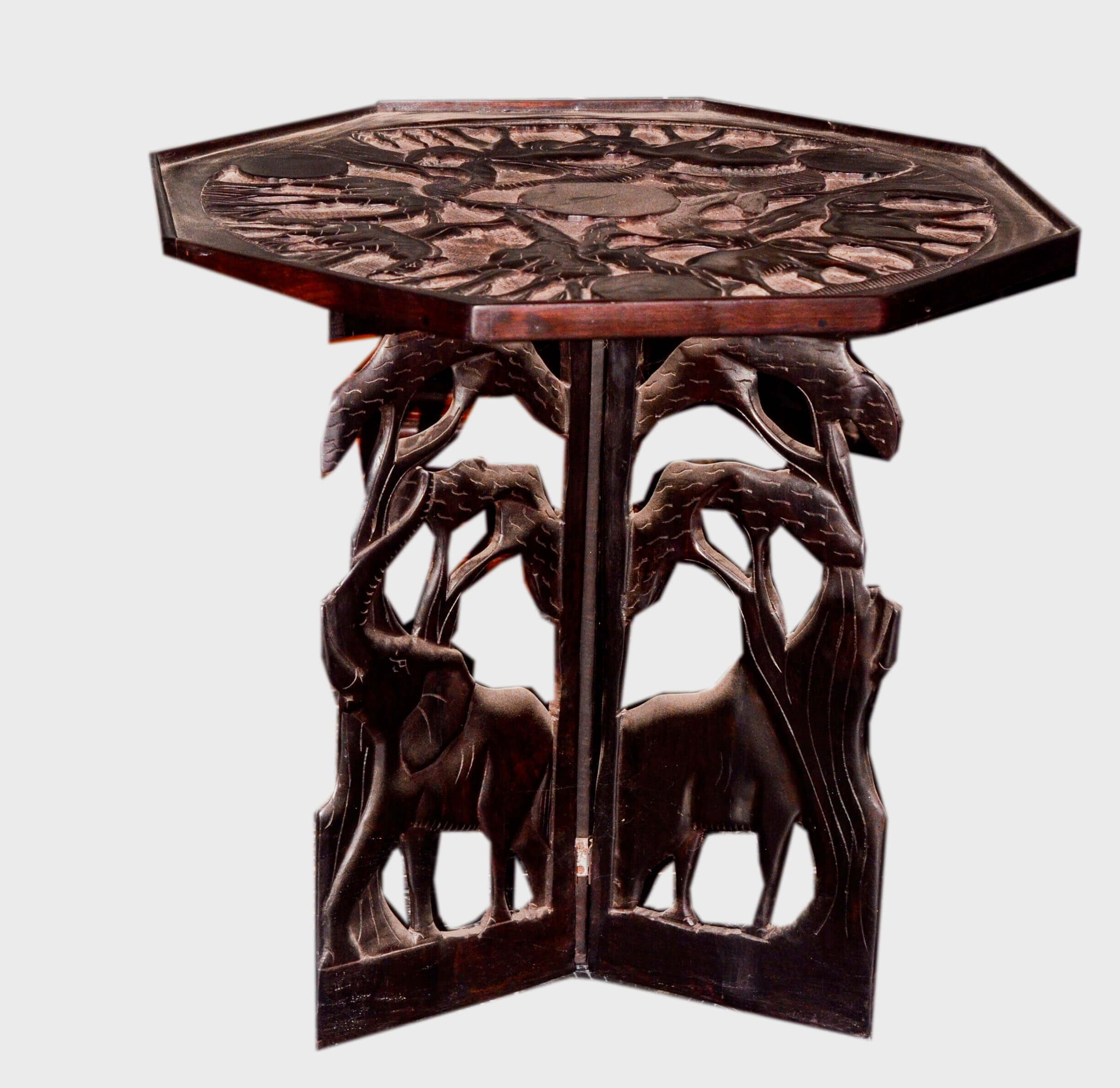 Hand-carved solid wood African safari side table featuring giraffe and wildlife relief details. A bold artisan statement furniture piece.