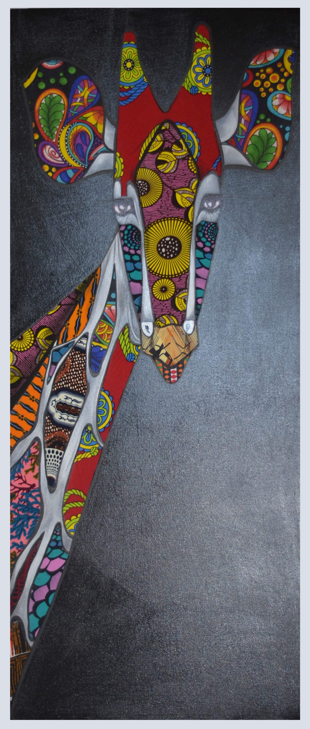 The artwork blends contemporary abstract style with wildlife inspiration, transforming the giraffe into a creative expression of color, culture, and imagination. The elongated neck and stylized features add sophistication and visual balance to the composition.