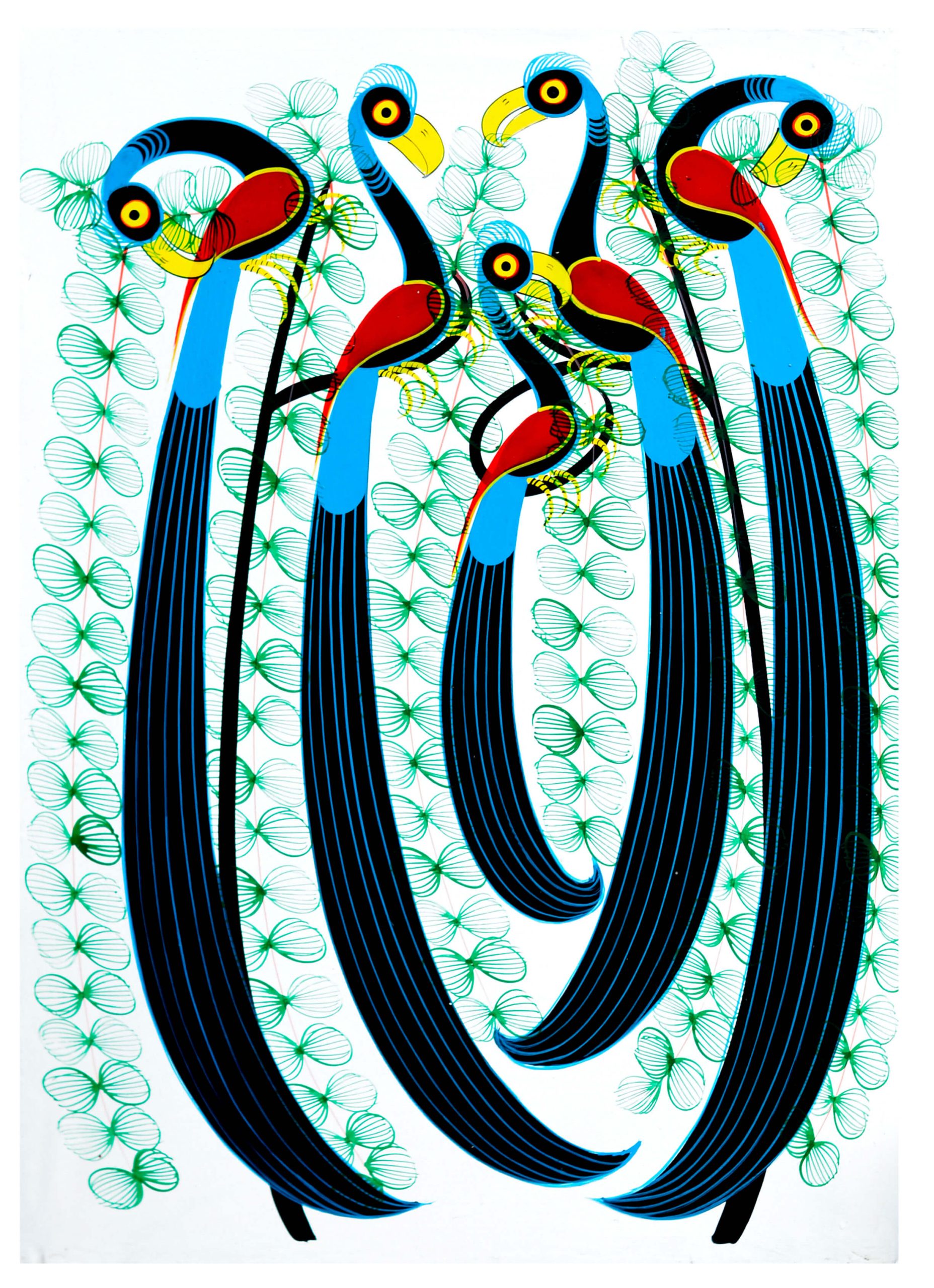 Behind the birds, delicate green floral patterns create a soft decorative backdrop that enhances the visual balance of the piece. The combination of strong graphic lines and light botanical details gives the painting a unique blend of modern design and folk-art inspiration.