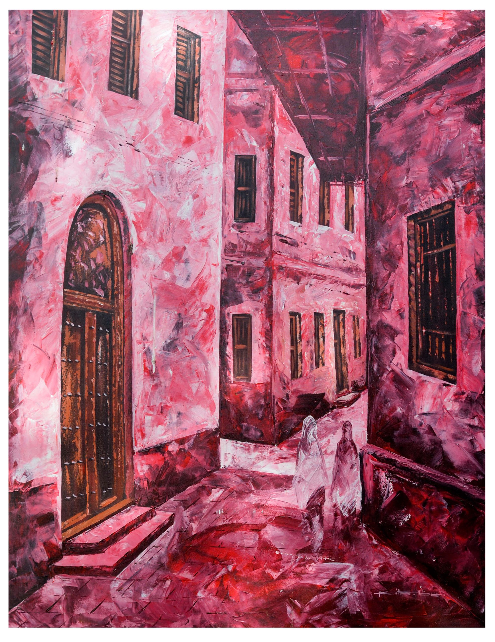 The dominant red palette gives the artwork a dramatic and emotional quality, while layered brushstrokes create movement and depth throughout the painting. The architectural elements, shadows, and perspective draw the eye deeper into the scene, evoking the charm of an old city neighborhood.