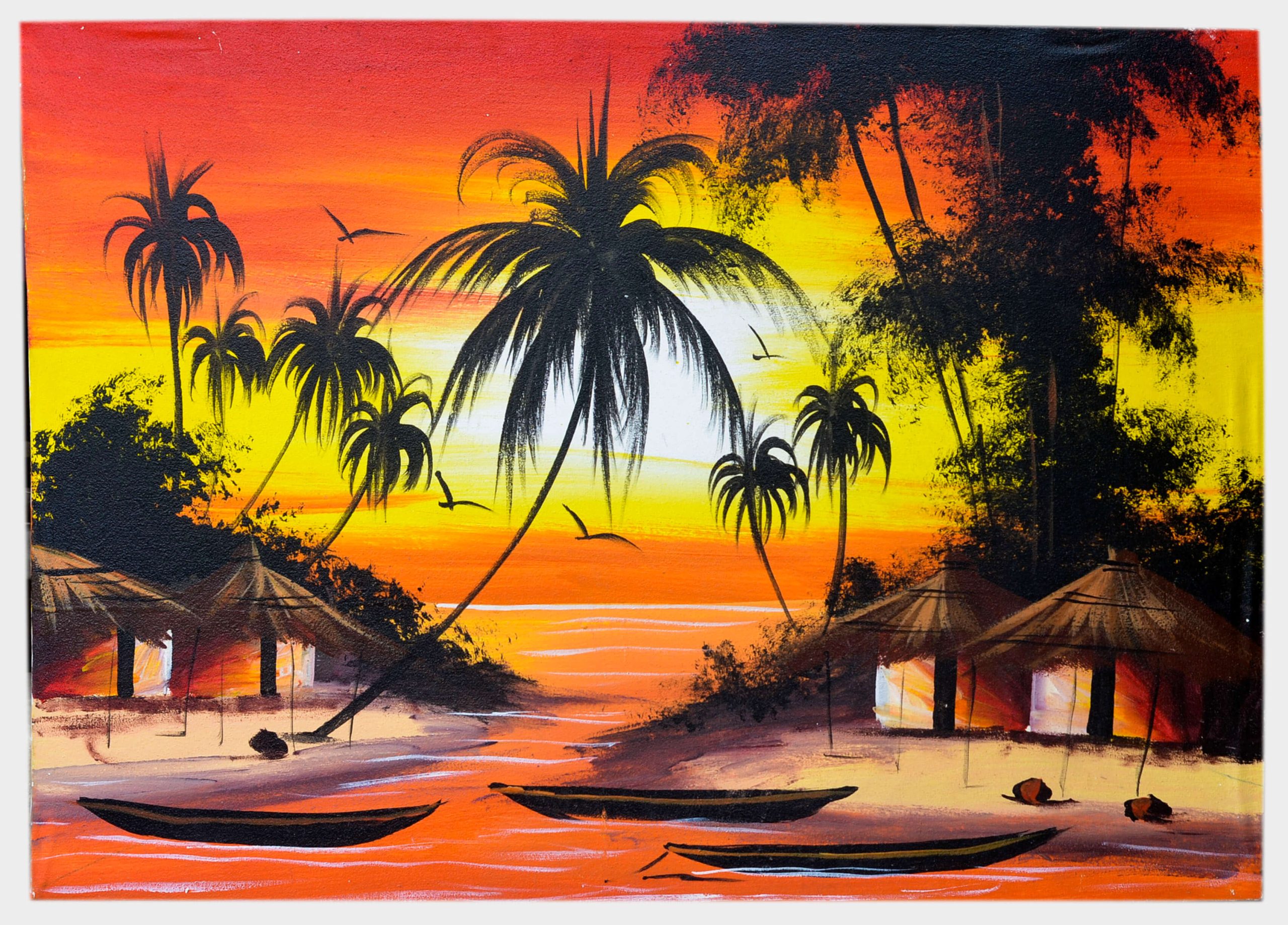 A warm and vibrant tropical landscape painting featuring palm trees, village huts, and boats at sunset.